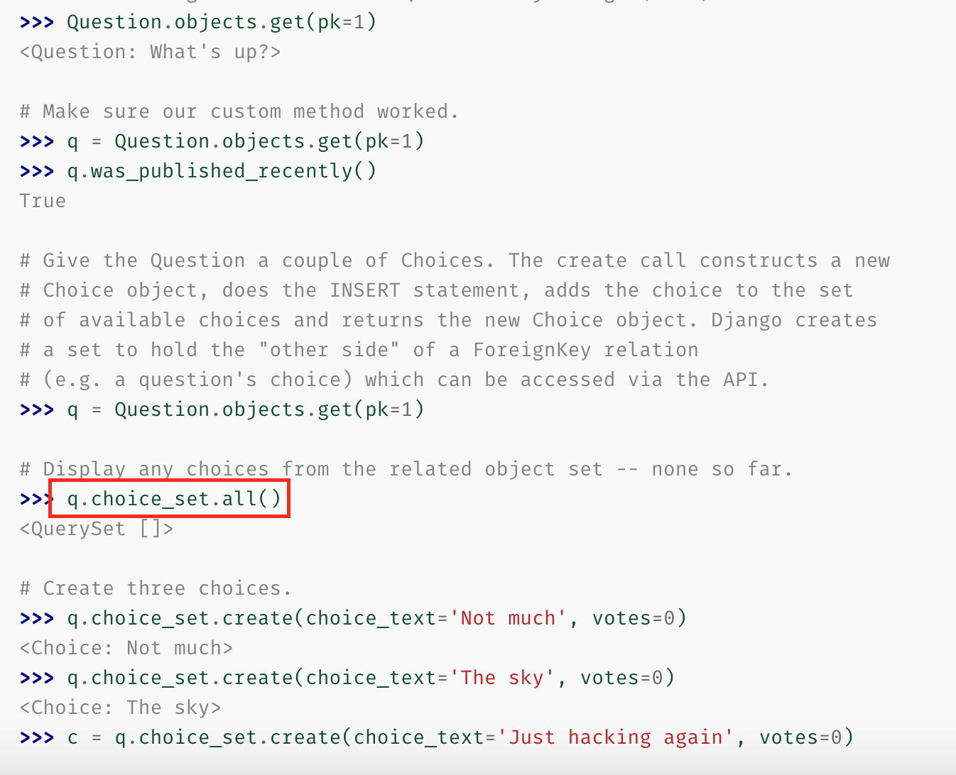 q.choice_set.create(choice_text='Not much', votes=0) // Choice 모델에 row를 생성